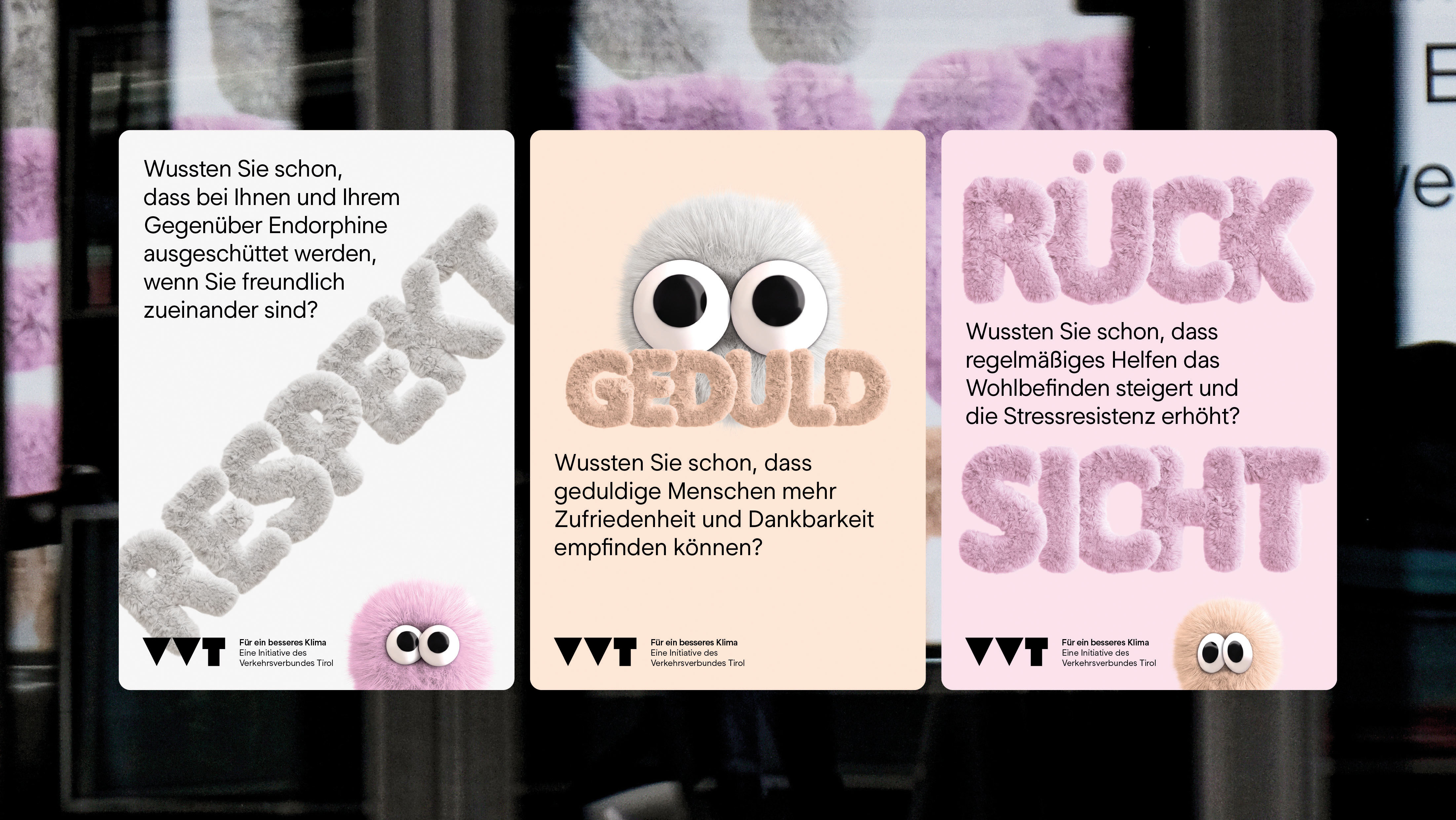 Angi Reisinger gibt Einblick in die Entstehung der preisgekrönten Kampagne „Rücksicht“, welche sie Ende 2024 für den Verkehrsverbund Tirol (VVT) umsetzen konnte. Respekt, Geduld und Rücksicht sind für ein gutes Miteinander im öffentlichen Verkehr unerlässlich. Die Kampagne „Rücksicht“ macht diese Werte sichtbar: Flauschige Buchstaben, die vertrauten Farben der Fahrzeugflotte und charmante Helfer mit großen Kulleraugen setzen ein liebevolles Zeichen für mehr Miteinander und Wertschätzung im Öffi-Alltag – und für ein besseres Klima.